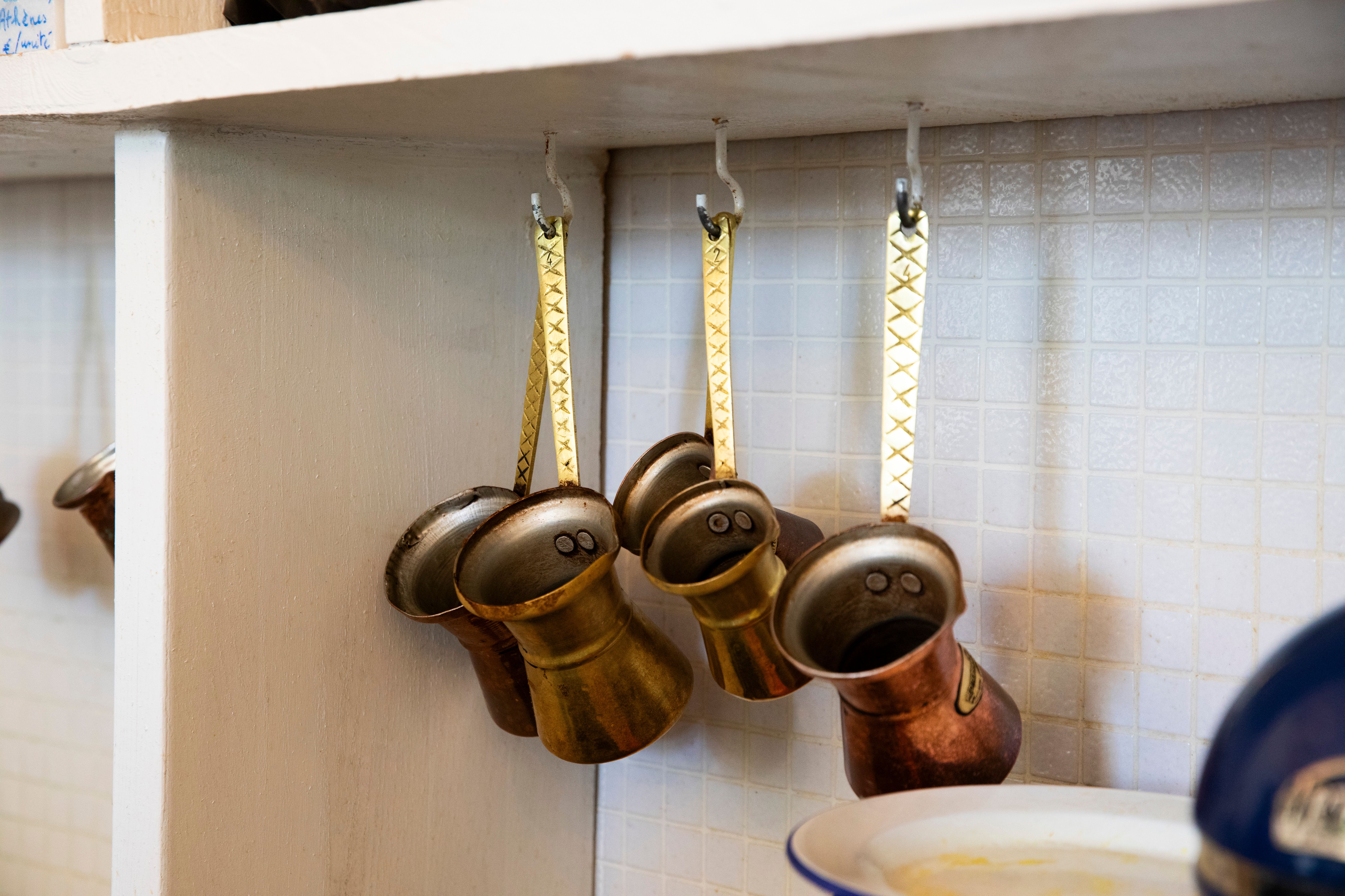 On est le seul endroit de la capitale qui sert à la fois du café grec chaud, cuit dans un briki en cuivre qui chauffe dans un hovoli rempli de sable, et le seul endroit qui fait les cafés frappés glacés avec nos machines importées d’Athènes. On propose aussi les freddo expresso et les freddo cappuccino, faits avec ces mêmes mixeurs colorés, et littéralement toute la communauté grecque de Paris et des environs s’est passé le mot et débarque chaque weekend.